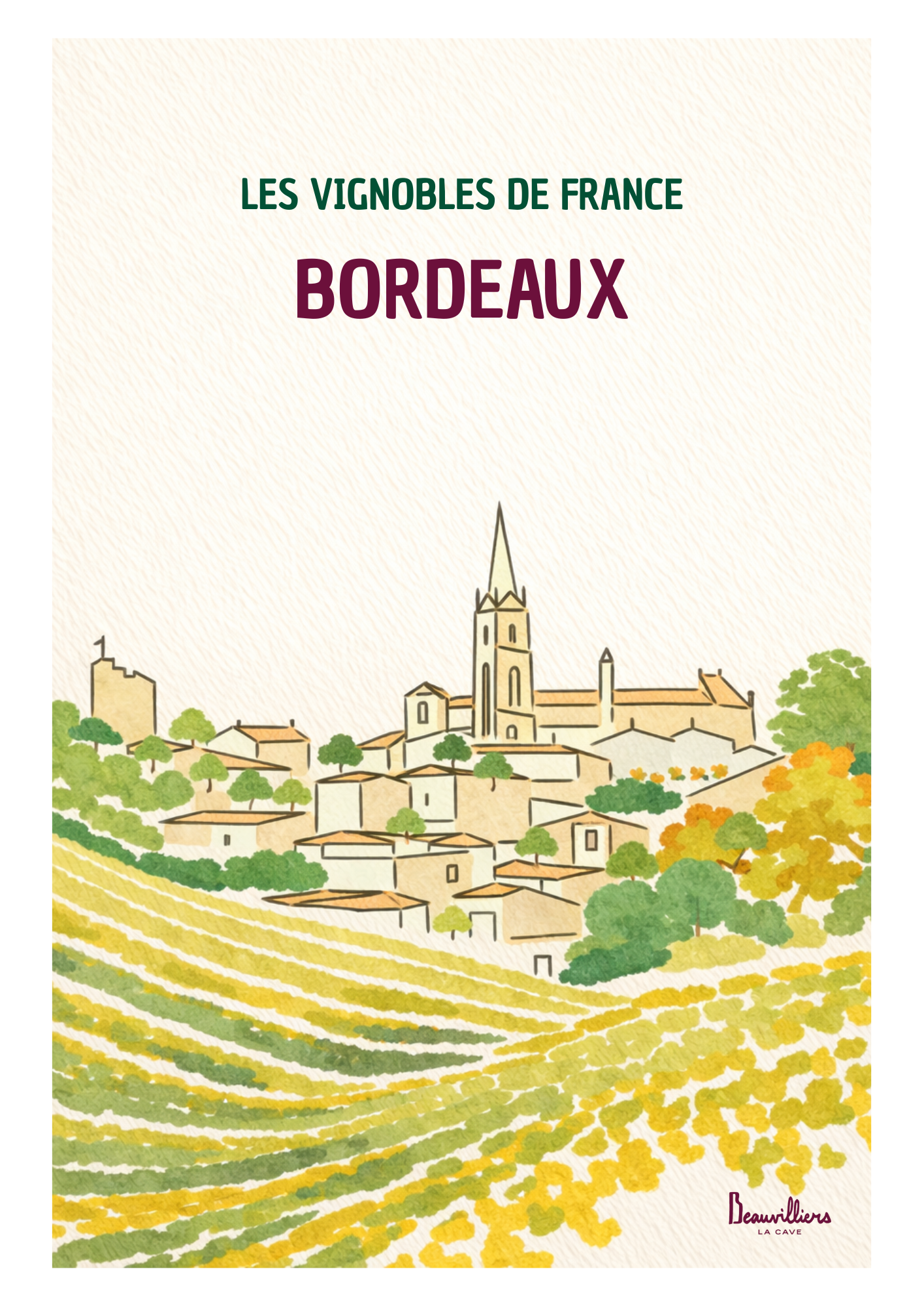 L’affiche : Bordeaux Berceau de certains des vins les plus prestigieux au monde, le vignoble de Bordeaux s’étend entre estuaire, rivières et terres historiques façonnées par la viticulture depuis des siècles.