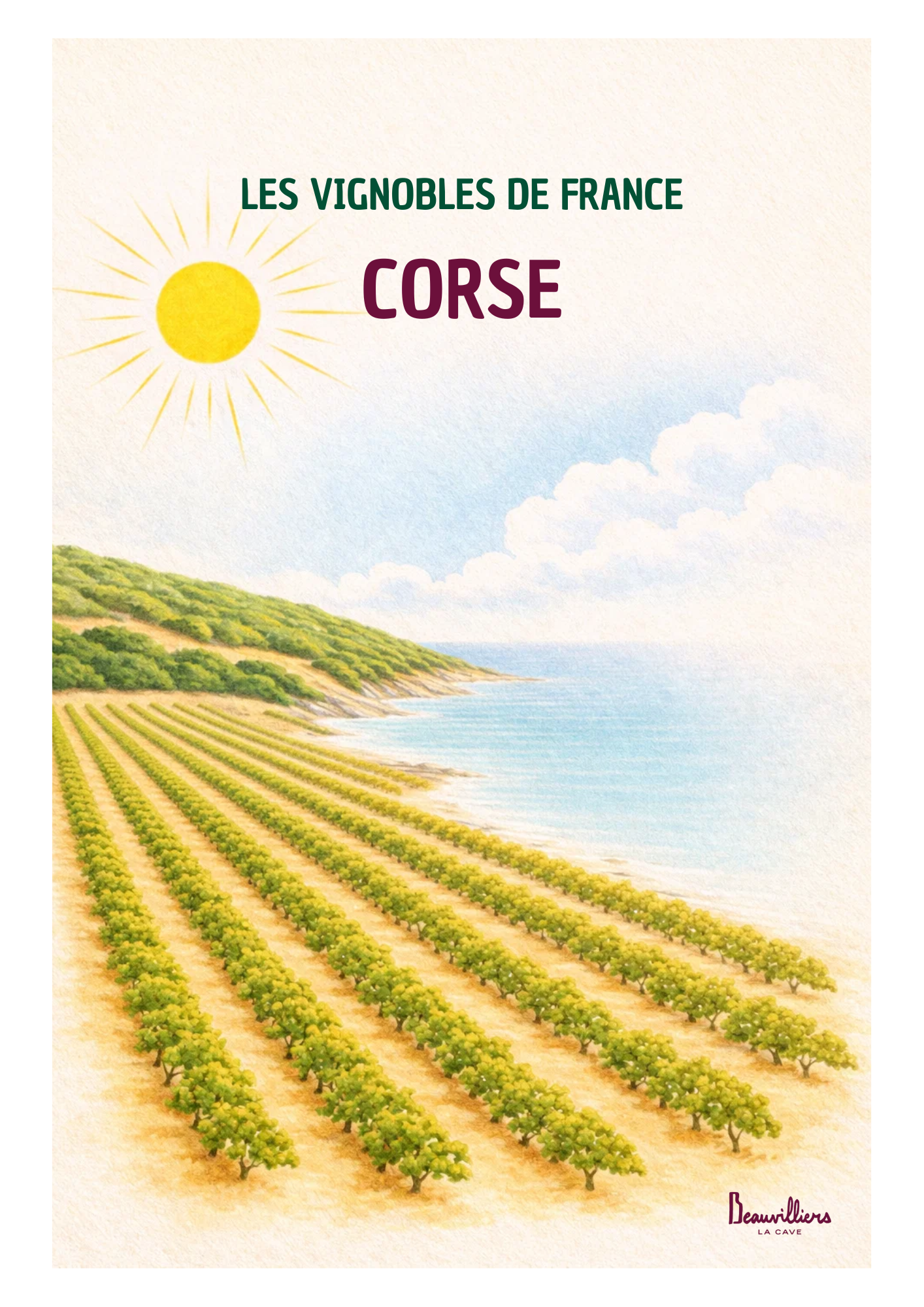 L’affiche : Corse Entre mer et montagne, le vignoble corse offre des vins de caractère marqués par leur terroir insulaire. L’affiche traduit l’authenticité et la beauté sauvage de cette région, où tradition et nature se rencontrent.