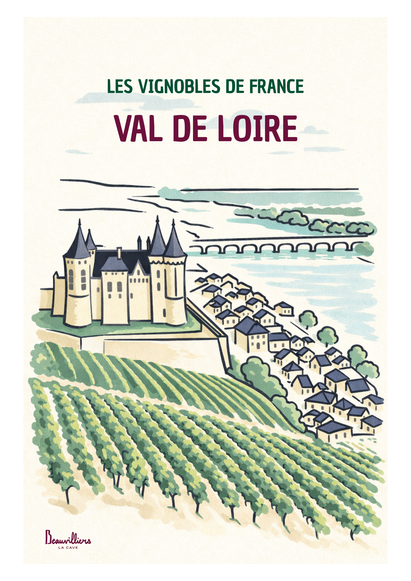 L’affiche : Val de Loire S’étendant le long du plus grand fleuve de France, le Val de Loire propose une diversité remarquable de styles et d’appellations. Cette affiche reflète l’élégance et la richesse de ce vignoble historique, classé parmi les plus emblématiques du pays.